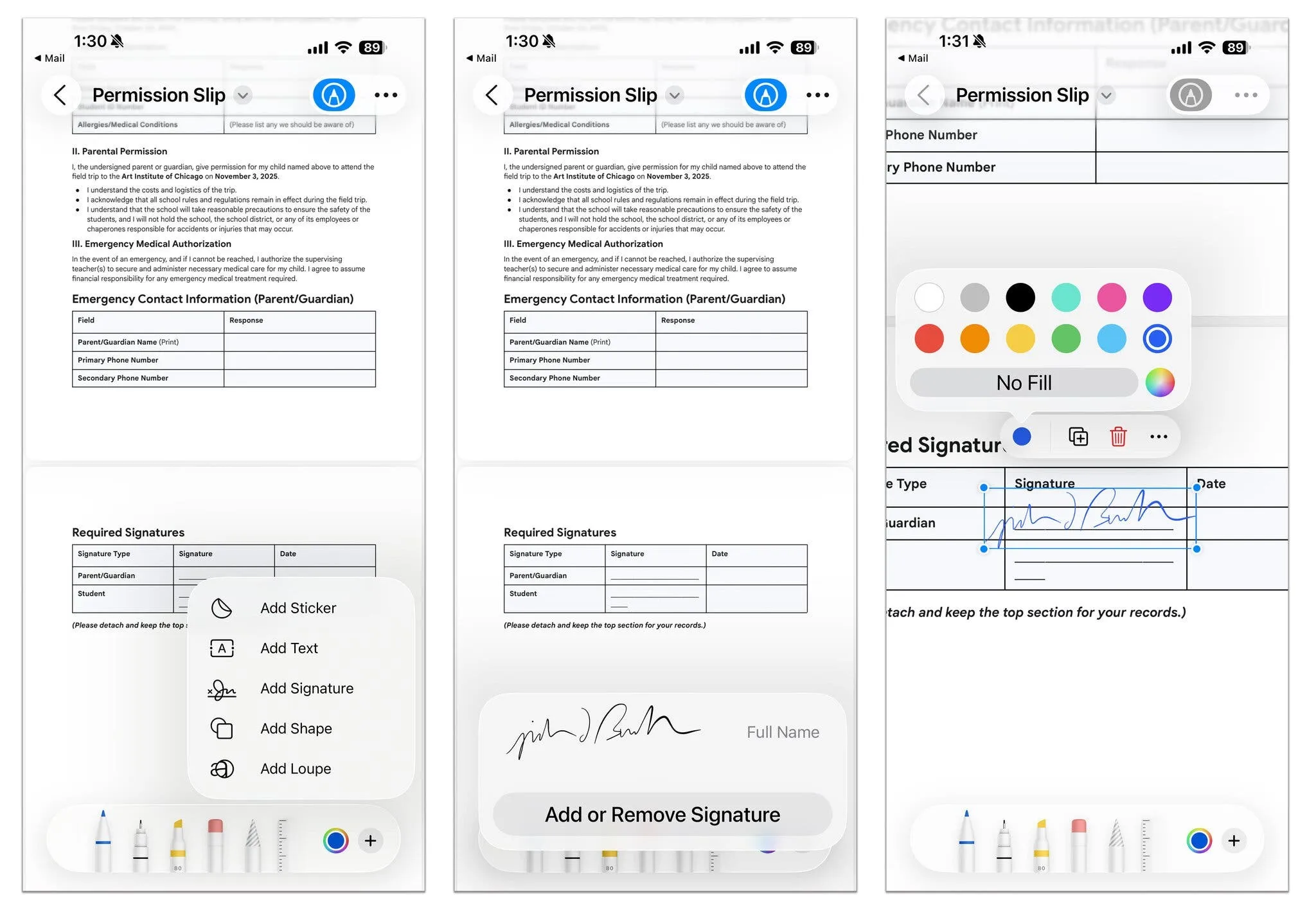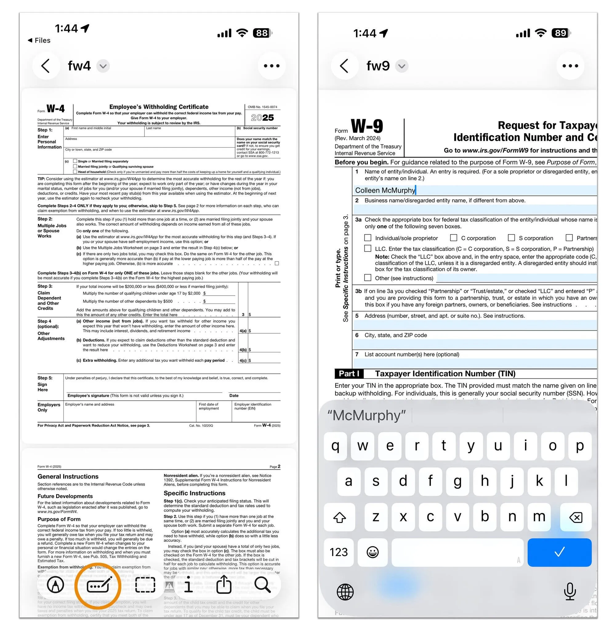 Ако имате PDF формуляр с редактируеми текстови полета, можете да ги попълните директно на устройството си и да го изпратите назад като отговор по имейл. Отворете PDF файла в Preview и докоснете втората икона отляво в лентата с принадлежности. Това маркира текстовите полета, които към този момент можете да попълните, като пишете или употребявате функцията за автоматизирано попълване.