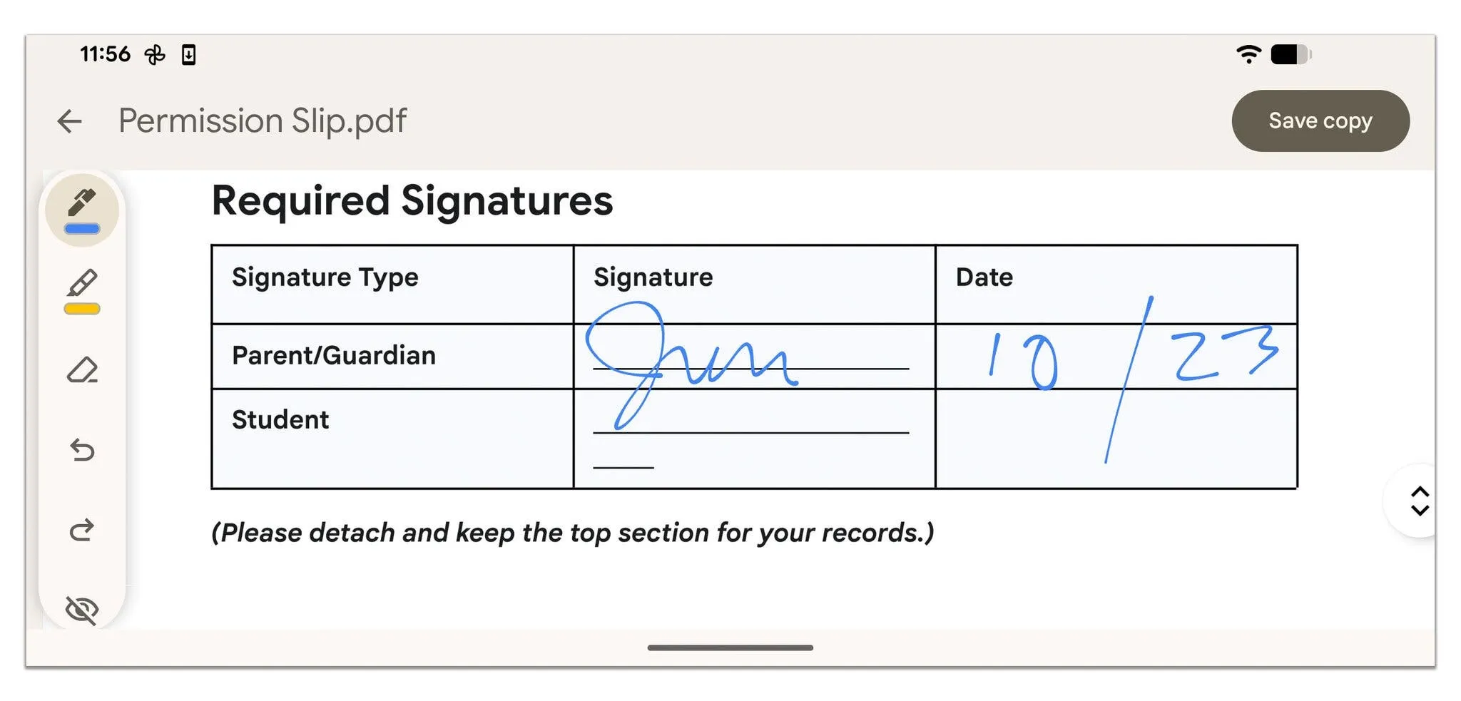 Приложението Гугъл Files включва принадлежности за маркиране и анотиране на PDF документи и изображения. Отворете PDF файл и докоснете иконата на молив, с цел да се покаже лента с принадлежности в долната част на екрана с икони за цифрово маркиране на текст или писане на бележки в документа. В Гугъл Drive докоснете молива и след това „ Анотация “, за да получите същата лента с принадлежности. (Samsung също има свои лични принадлежности за потребителите на Galaxy за сканиране и анотиране на PDF файлове.)