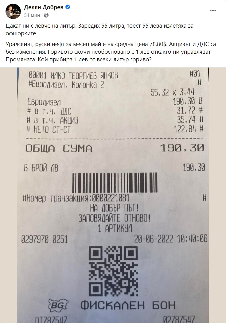 Цакат ни с левче на литър. Заредих 55 литра, т.е. 55 лв. излетяха за офшорките, това декларира в профила си във фейсбук депутатът от ГЕРБ Делян Добрев.