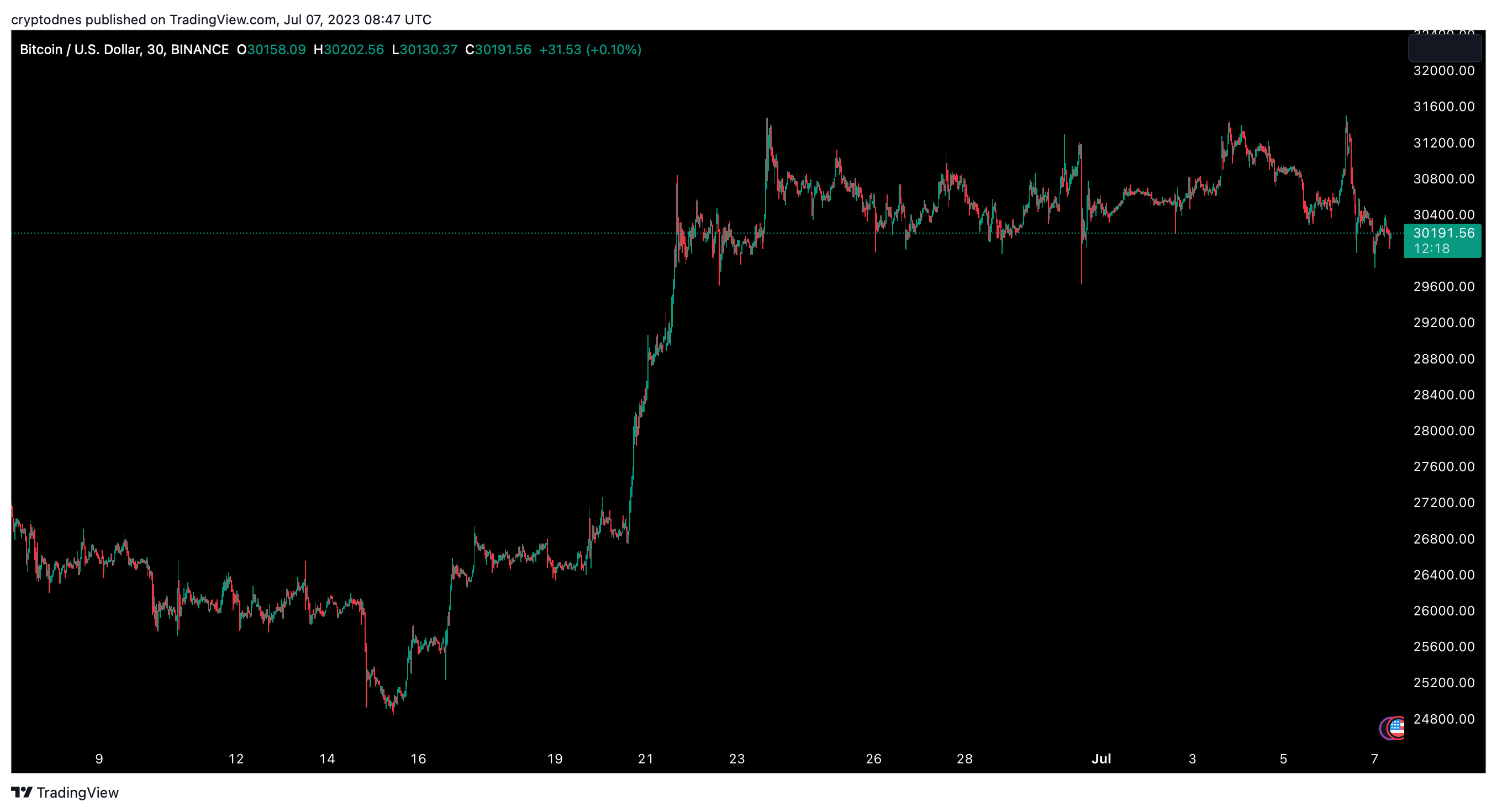 Така на 6 юни цената на BTC доближи дъно покрай $29,200 и консолидира загубите си. Към момента на писане на публикацията Биткойн се търгува на към $30,100, отбелязвайки 2.8% спад през последните 24 часа, по данни на CoinMarketCap.