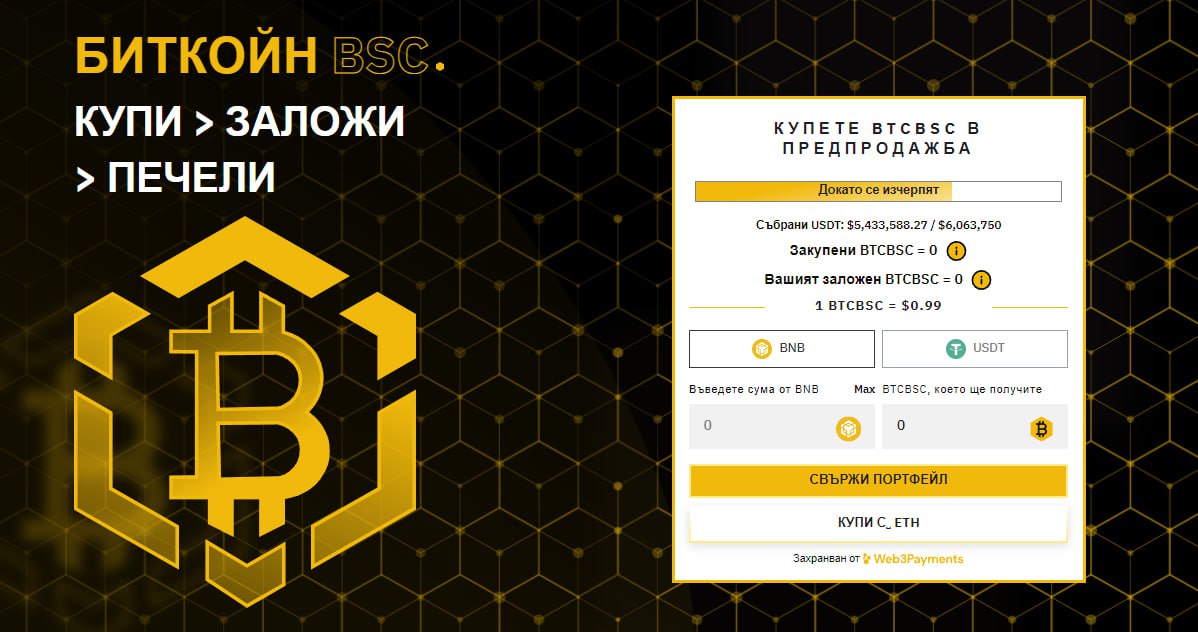 - Посетете уеб страницата на предварителната продажба на Bitcoin BSC