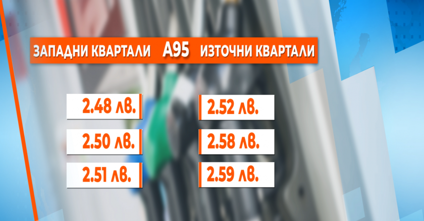 В западните квартали на София да вземем за пример, бензин А95 можете да откриете за сред 2,48 и 2,51 за литър според от съответната верига бензиностанции. В източните квартали обаче на същите вериги цените са надлежно сред 2,52 и 2,58.