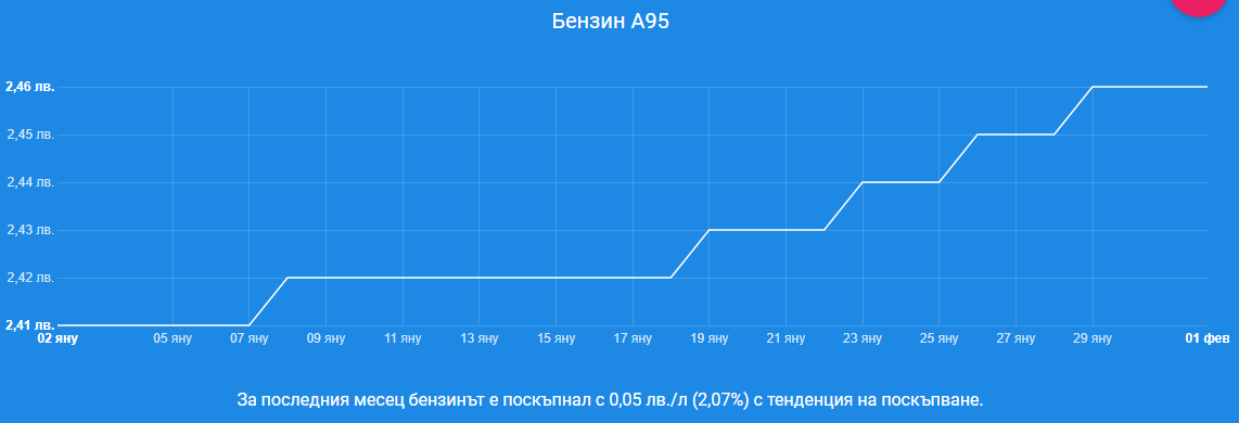 При най-масовия бензин А95, нарастването за последния месец е с 5 стотинки, което са 2,07%.