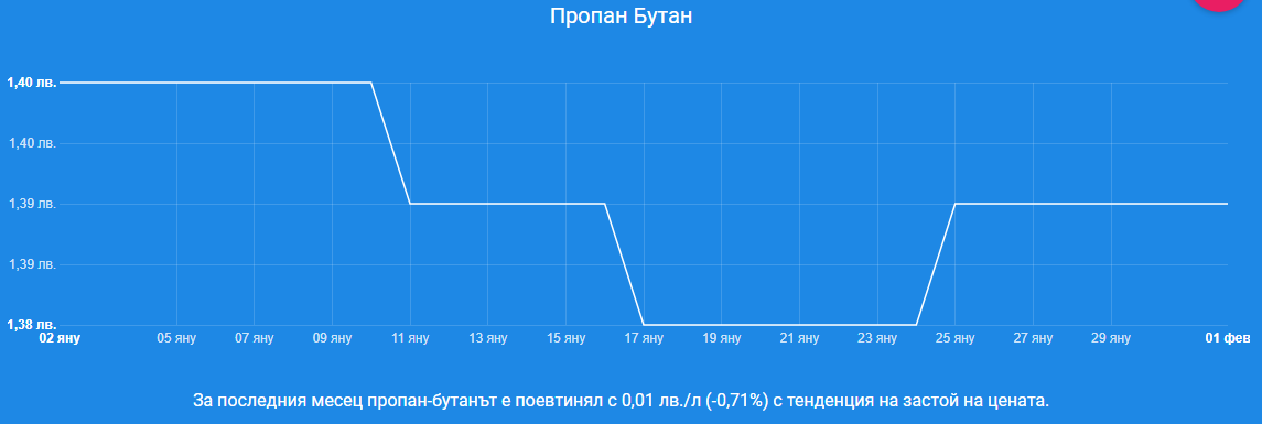При газта, цената се е намалила с 1 стотинка на месечна база, което е поевтиняване с 0,71%. Тенденцията демонстрира предстоящ застой на цена от към 1,40 лв. за литър.