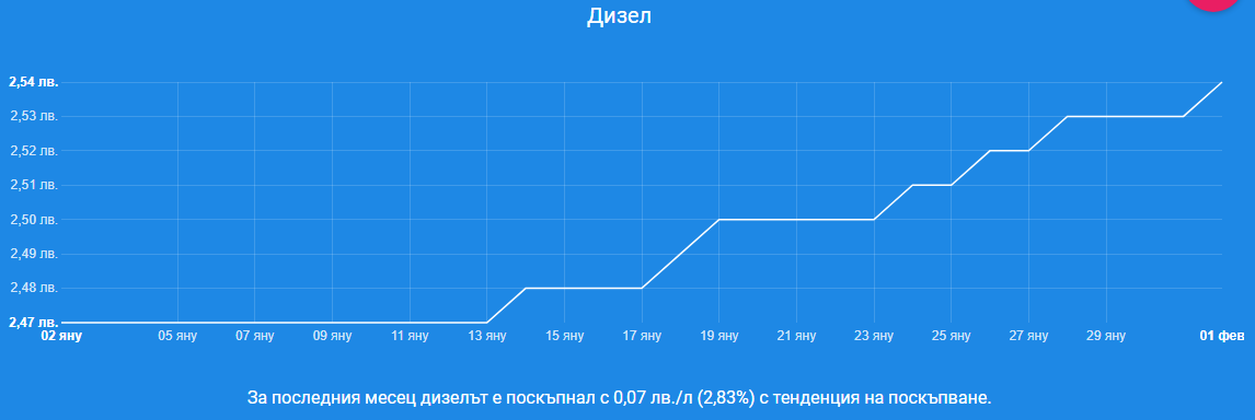 Най-засегнато е дизеловото горива, което от началото годината е поскъпнало със 7 стотинки на литър, което е нарастване с 2,38%. Тенденцията планува да продължи да се усилва, като се чака да доближи стойности съвсем до 3 лв. за литър.