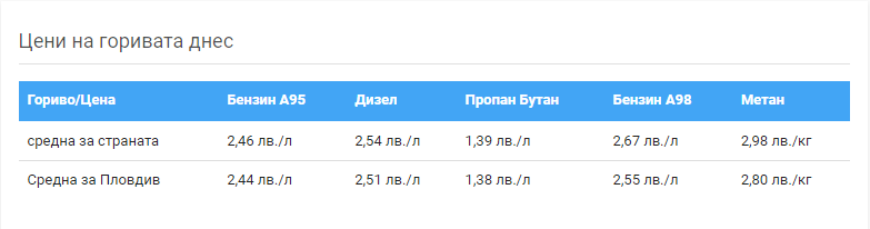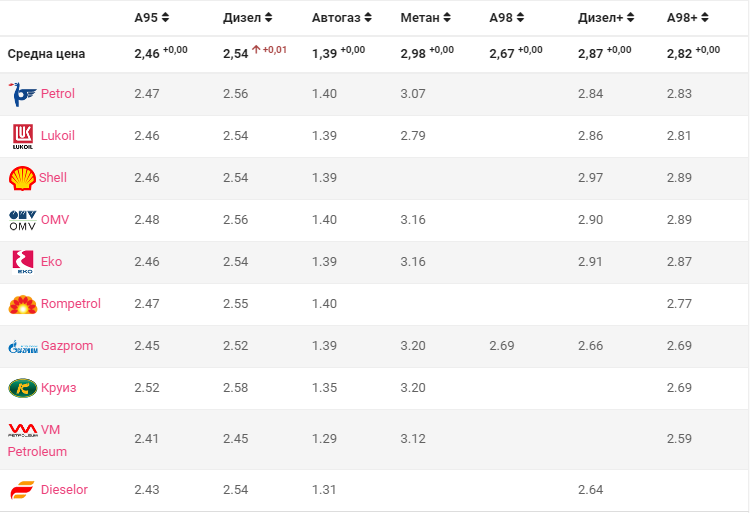 В момента междинната цена на литър от най-масовия бензин А95 под тепетата се търгува за 2,44 лв. за литър, дизелът приблизително коства 2,51 лв., а газта – 1,38 лв. за литър. Данните са от уеб страницата fuelo, като справката демонстрира разлика от 2 стотинки при бензина, 3 при дизела и 1 при газта, по отношение на междинните за България.