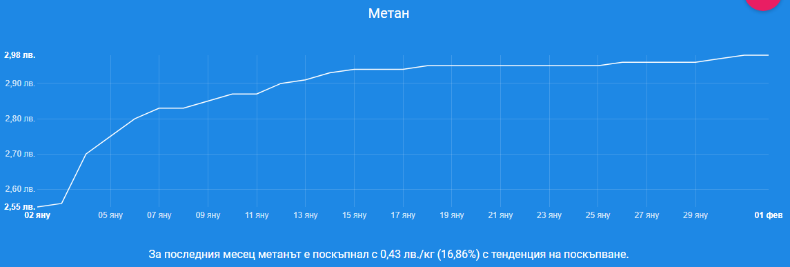 Най-голямо нарастване от началото на годината има при метана. Той е поскъпнал приблизително с 43 стотинки за последния месец, което са 16,86%. В момента цената на метана е 2,98 лв. за кг, при стойност от 2,55 лв. при започване на януари.