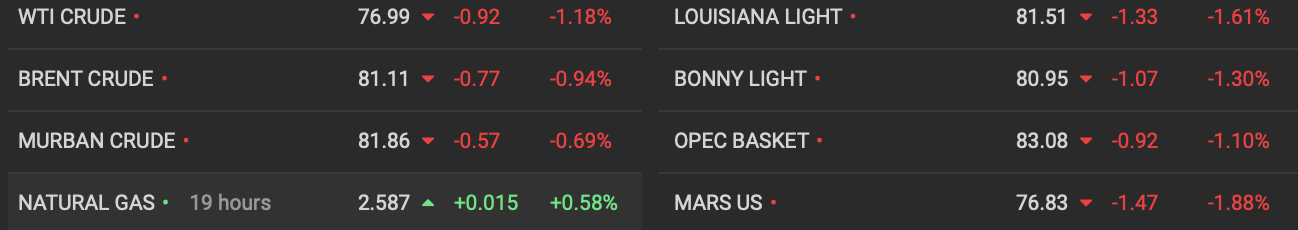 Според данните на OilPrice.com все още на писане на публикацията цената на барел необработен нефт вид “ ” се е намалила с $0.77 до $81.11 (0.93%), а цената на барел необработен нефт вид “ ” – с $0.92 до $76.99 (1.18%).