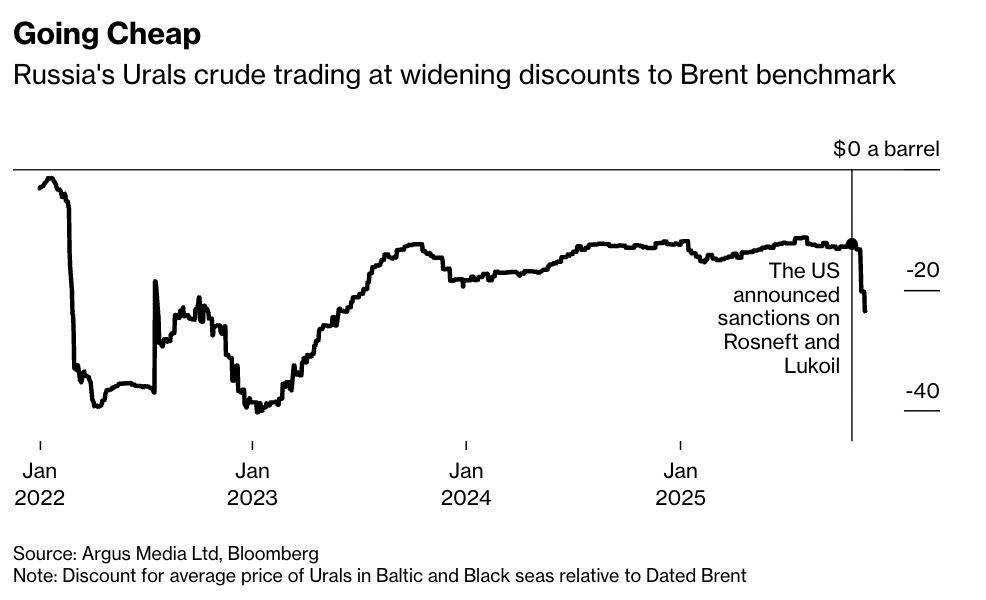 Руският нефт стартира да се търгува със обилни отстъпки през последните дни, преди крайния период за влизане в действие на новите наказания против двата съществени производителя. Отстъпката за Urals спрямо цената на сорта Brent доближи 23,51 $ за барел, което е рекордно високо равнище от март 2023 година Преди американските наказания съветският нефт се продаваше с 12-13 $ по-евтино от Brent.