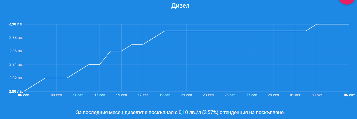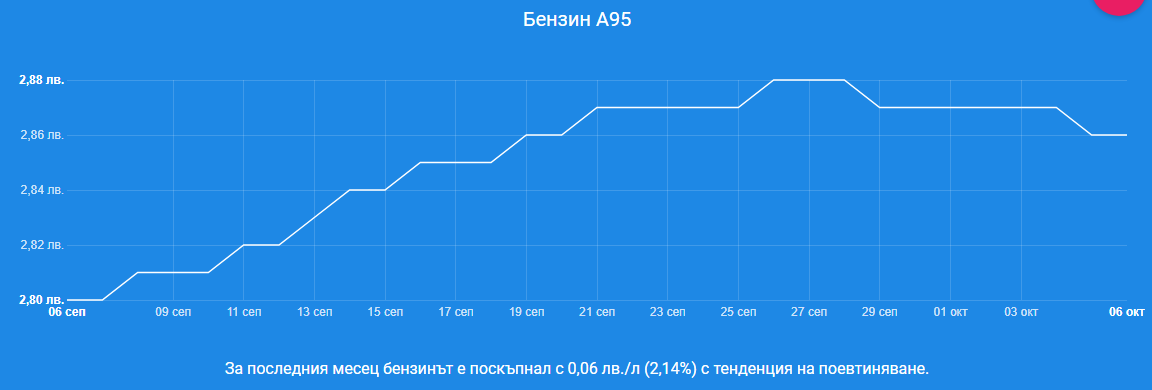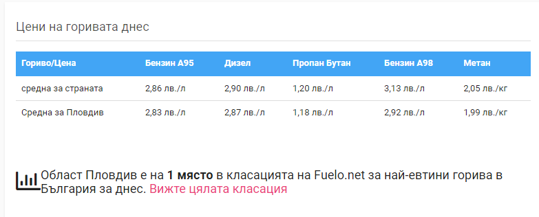 Към днешна дата най-масовият бензин А95 се търгува приблизително за 2,86 лева./л. Дизелът е 2,90 лева./л, а пропан-бутанът – 1,20 лева./л. Метанът се предлага приблизително за 2.05 лева./кг. Най-ниските цени на горива в страната са в област Пловдив, като стойностите са надлежно: бензин – 2,83 лева./л, дизел – 2,86 лева./л, пропан-бутан – 1,18 лева./л и метан – 1,99 лева./кг.