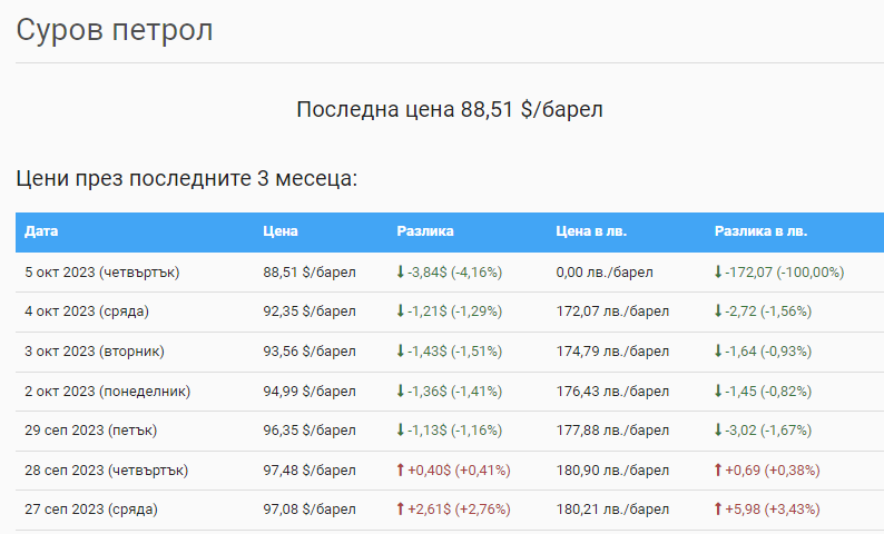 Припомняме, че след нахлуването на Русия в Украйна през февруари 2022 година цените на петрола скочиха, надхвърляйки 120 $ за барел през юни предходната година. Те спаднаха до малко над 70 $ през май тази година, само че от този момент непрестанно се покачват, защото производителите се пробват да лимитират доставките, с цел да поддържат пазара. Неизменно това води и повишение на цената на колонките. В края на септември и началото на този месец горивата в България още веднъж се приближиха до стойности от съвсем три лв. за литър.
