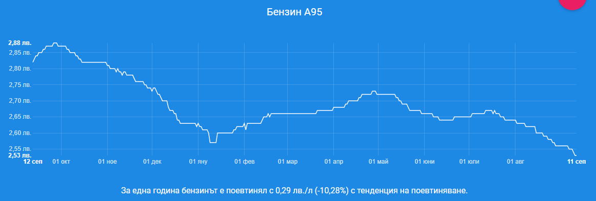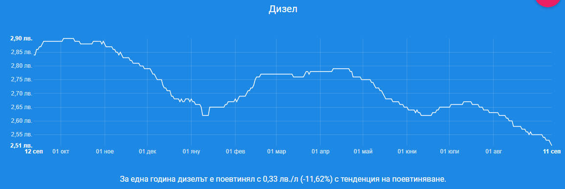Това е и най-ниската цена на двете водещи горива от повече от 2 години насам. Справка в профилираната платформа демонстрира, че единствено за последните 12 месеца бензинът е поевтинял с 0,29 лева./л (10,28%), а наклонността е да продължи да пада. За същия интервал цената на дизела се е сринала с 0,33 лева./л, което са 11,62%. Тенденцията и при него е да продължи да се намалява.