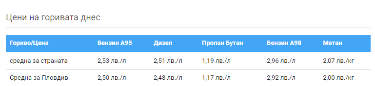Според данните на уеб страницата fuelo към днешна дата междинните цени на горивата в южната съседка, обърнати в левове, са надлежно – бензин А95 – 2,16 лева./л и дизел – 2.24 лева.л.
