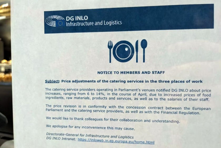 Табели в така наречен Flower Bar и в ресторанта на евродепутатите в Страсбург осведомят, че нарастването се дължи на по-високите разноски за артикули, сила и заплати. Табелите гласят: „ Извиняваме се за неудобството, което това може да аргументи “.