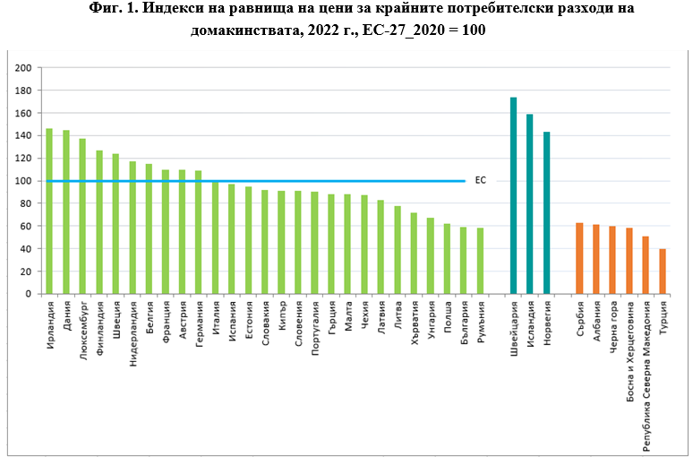През 2022 година нивата на цени за крайните потребителски разноски на семействата се разграничават доста в 27-те страни - членки на Европейски Съюз. Най-високи равнища на цените са регистрирани в Ирландия (146% от междинното за ЕС), Дания (145%) и Люксембург (137%). Най-ниско е нивото на цените в Румъния (58%), България (59%) и Полша (62%).