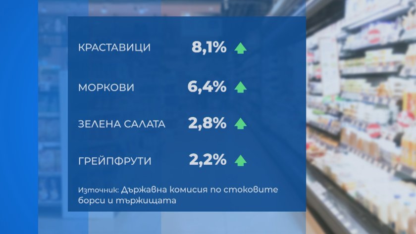 При плодовете и зеленчуците максимален скок има в цената на оранжерийните краставици - над 8%, и морковите с повече от 6 на 100. Лукът поевтинява най-вече от всички храни - с 10 на 100. Фактори като по-високите цени на тока и газа, съгласно специалисти, ще допринесат за инфлацията при храните, само че не значително.