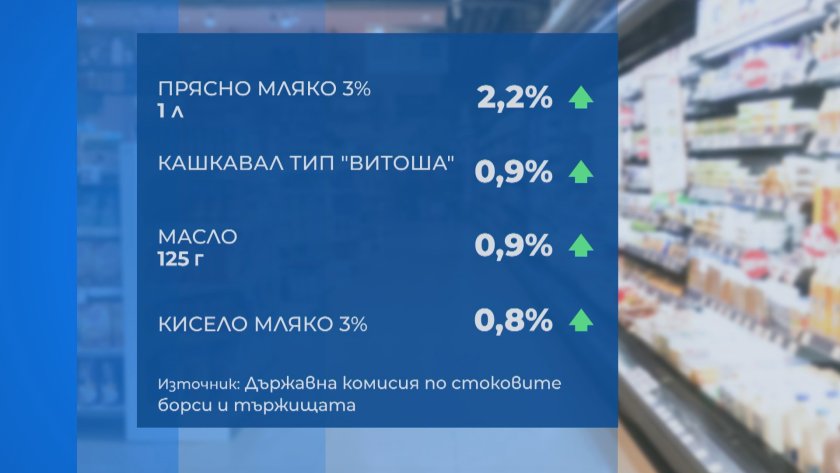 При храните от скотски генезис най-сериозно нарастват яйцата и пилешките бутчета - близо с 3 на 100. При млечните артикули цената на прясното мляко скача с над 2%, а кашкавалът, маслото и киселото мляко с съвсем %.