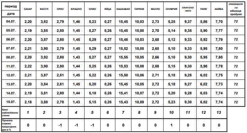 Пакетче краве масло от 125 грама нараства с 6 стотинки и се продава по 2,72 лв.. Пилешкото месо подвига цената си със 7 ст. до приблизително 6,02 лв. за кг. Захарта се продава по 2,18 лв. за кг в края на седмицата, а брашно вид “500” - по 1,43 лева за кг. Оризът поевтинява с 0,7 на 100 и се търгува по 2,78 лв. за кг. Яйцата в края на седмицата поевтиняват с 1 стотинка и се продават по 0,26 лв. за брой.