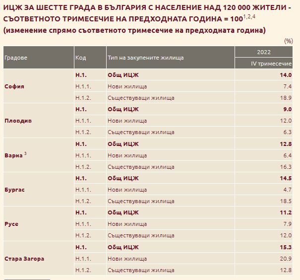 През четвърто тримесечие на 2022 година цените на жилищата в страната са се нараснали с 0.4% по отношение на предходното тримесечие и с 13.4 % по отношение на същото тримесечие на 2021 година. Спрямо предходното тримесечие най-голямо нарастване е записано в град Стара Загора (+7.4%), следван от градовете Бургас и Варна - надлежно с (+4.7%) и (+2.1%), а намаляване на цените се следи в град София (-2.5%).