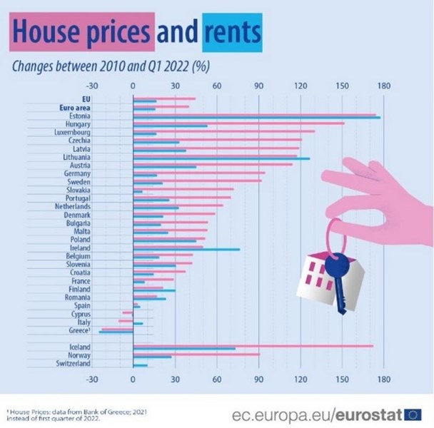 Според последния отчет на Eurostat сред 2010 година и първото тримесечие на 2022 година цените на жилищата в Европа са се повишили с 45%. В същото време в 19 страни от Европейски Съюз растежът на цената на жилищата изпреварва този на наемите.