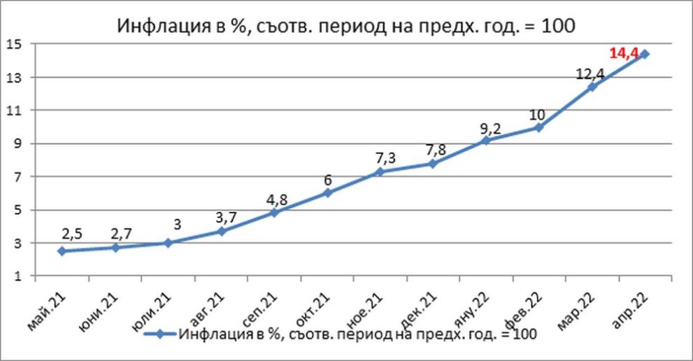 Видно от данните на графиката, инфлацията измерена посредством показателя на потребителските цени (ИПЦ) за април 2022 година, е 14,4 на 100 по отношение на същия интервал на миналата година. Месец по-рано тази инфлация е била 12,4 на 100 а предходната година по същото време едвам 2,5 на 100. Ако се заровим по-надълбоко в динамичните редове на месечната инфлация, за които данни ни дава националната статистика, то може да стигнем до доста притеснителни заключения.