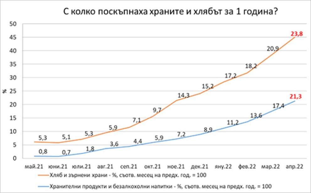 Тук нещата стават още по-притеснителни. Инфлацията при питателните артикули и безалкохолните питиета (синята линия) доближава 21,3 на 100 през април 2022 г. спрямо април 2021 година За съпоставяне, една година по-рано, през май 2021 година по отношение на месец май 2020 година, тя е била едвам 0,8 на 100. Налице е еволюционен растеж, който съгласно болшинството от прогнозите и екстраполациите, които се вършат, ще продължи и през идващите няколко месеца. При хлябът и зърнените храни (оранжевата линия) обстановката е даже по-зле по отношение на общото ценово ниво при храните. Там приказваме за инфлация от 23,8 на 100 през април 2022 година по отношение на същия интервал на миналата година. За съпоставяне, година по-рано повишаването е било едвам 5,2 на 100 (май 2021 година по отношение на май 2020 г.).
