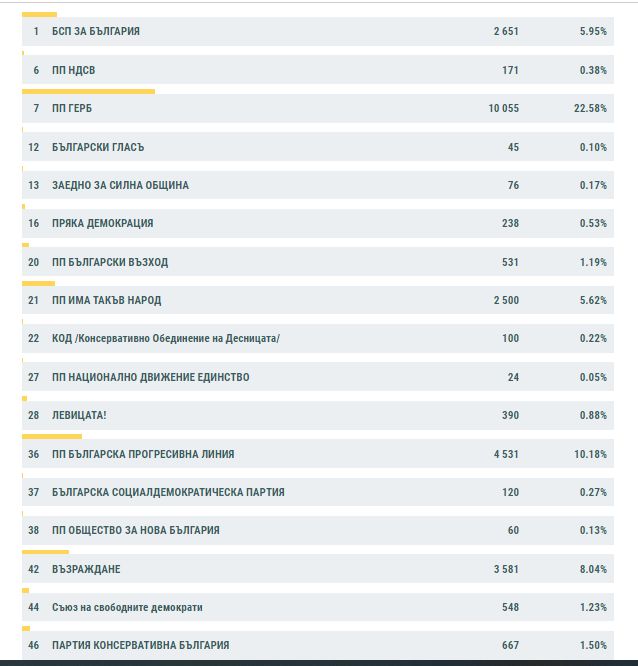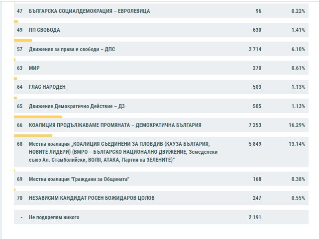 Ангел Георгиев от „ Възраждане ” е получил 3449 гласа, Савина Петкова от „ Браво, Пловдив ”, – 3080, Костадин Палазов от Българска социалистическа партия – 2464.