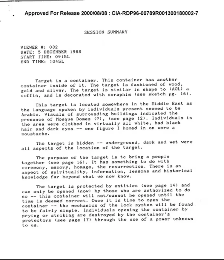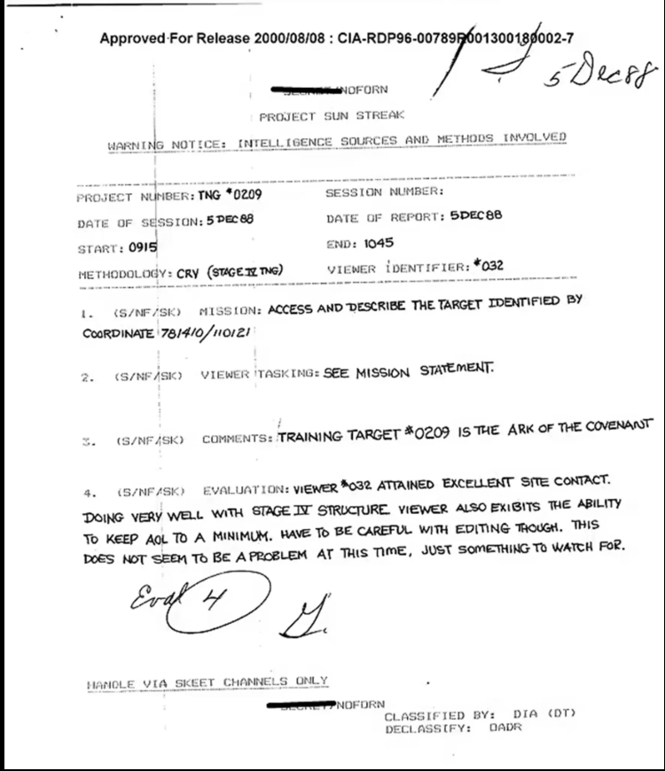 По време на сеанс на отдалечено наблюдаване на 5 декември 1988 година на отдалечен фен № 32 е била предоставена задачата да разпознава цел, която, неизвестно за какво, се оказва именитият Ковчег на Завета, съгласно документ, който е разкрит на 8 август 2000 година и се популяризира в обществените мрежи.