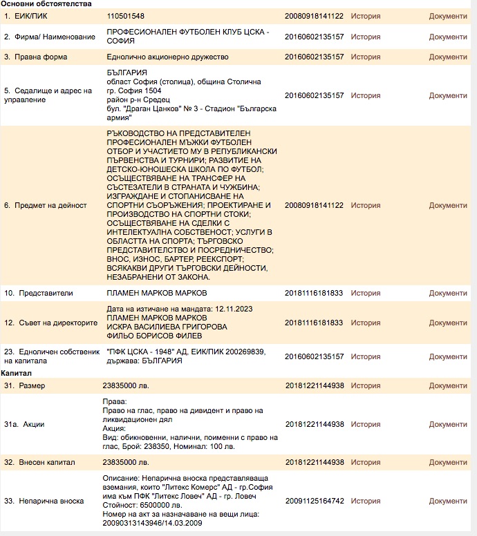 ЦСКА-София подвигна капитала с нови 6 млн. лв. и той към този момент е 23 835 000 лв., видя Sportal.bg . Червените са подхванали този ход на 11 декември 2018 година, а 10 дни по-късно смяната публично е станала факт.
