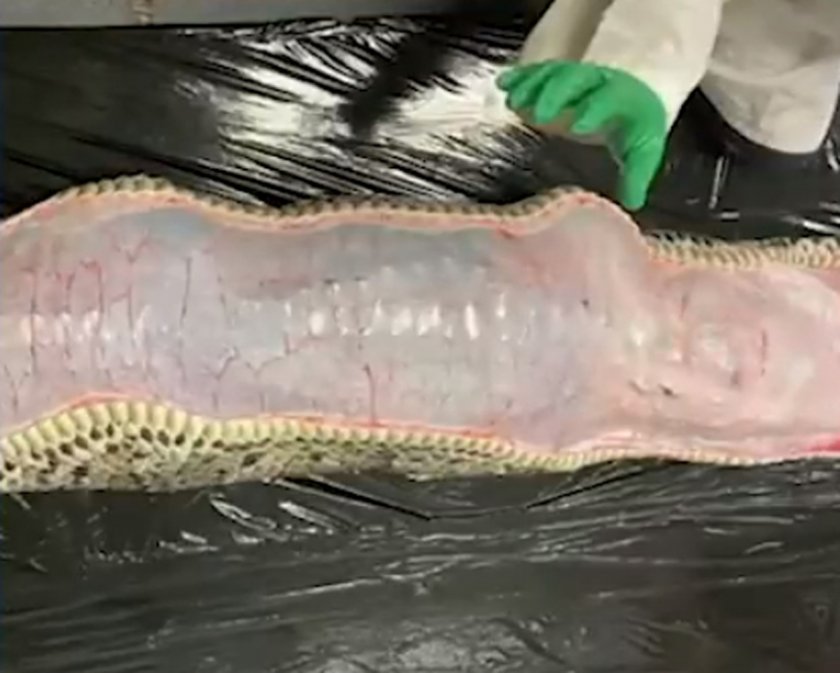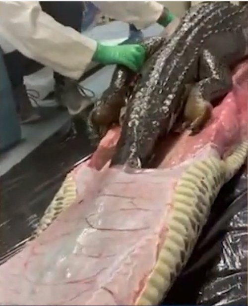 Видео, публикувано в обществените мрежи, демонстрира по какъв начин учени разрязват мъртвата змия и вадят от нея изцяло непокътнато тяло на алигатор. Според тях питонът е дълъг над 5 метра, а планове в него голям крокодил – 1,5 метра. Кадрите демонстрират по какъв начин няколко учени правят оценка огромна подутина в стомаха на питона, преди да го отворят и да получат по-добра картина какво има вътре.