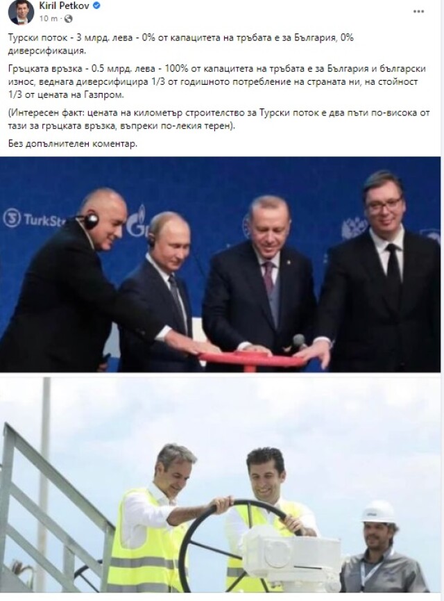 Петков написа: " Гръцката връзка - 0,5 милиарда лв., 100% от потенциала на тръбата е за България и български експорт, незабавно диверсифицира 1/3 от годишното ползване на страната ни, на стойност 1/3 от цената на " Газпром ".