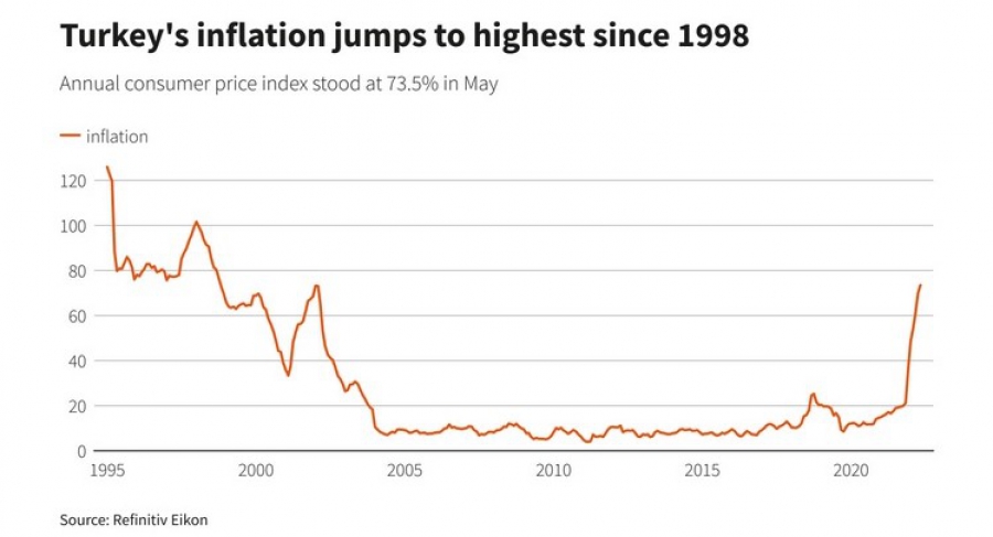 Инфлацията в Турция не стопира да пораства. Според формалните данни през май тя е достигнала 73,5% – най-високата стойност за последните 23 години. Предишният сходен връх беше през октомври 1998 година, когато годишната инфлация беше 76,6%, a страната се бореше да постави завършек на десетилетие на хронично висока инфлация.