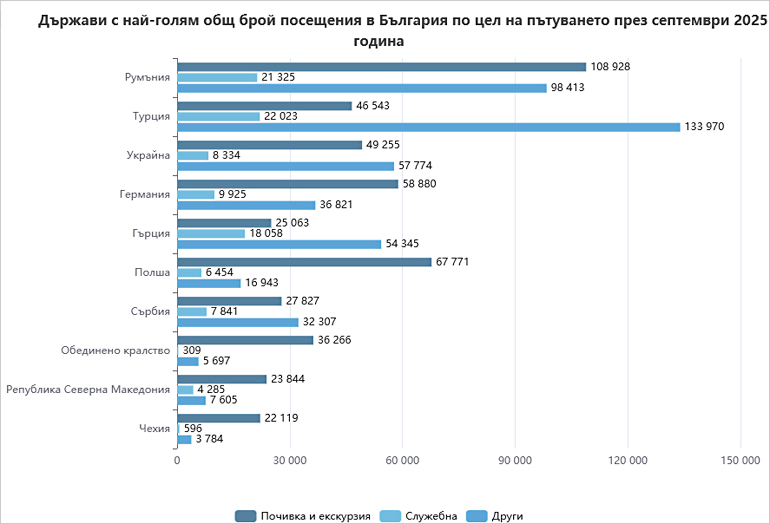 През септември 2025 година визитите на непознати жители в България са 1 306.0 хиляди, или с 3.5% повече в съпоставяне със същия месец на миналата година.