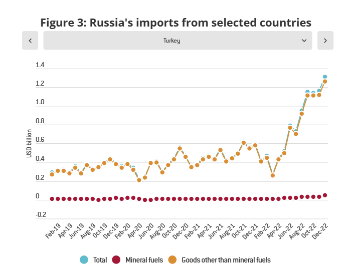 Обемът на износа от Турция към Русия доближи рекордни равнища през 2022 година, откакто страната стана един от главните направления за заобикаляне на европейското и американското ембарго.