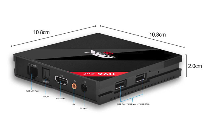 ТВ приставката разполага с един порт HDMI 2.0, два врата USB, оптичен аудио излаз SPDIF, излаз AV, слот за microSD карти, LAN порт RJ-45 и захранващ DC порт 5V2A. Това е плътно устройство с размери 10,8х10,8х2 см и тегло 131 грама, което се придвижва елементарно и заема напълно малко място на поставката за тв приемника.