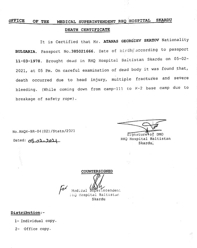 Твърденията за неточност на Атанас Скатов, която е довела до гибелта му, бяха разрушени на пух и прахуляк от формалните документи, които “24 часа” получи от свои източници. Той почина на 5 февруари при слизане от Лагер 3 под К2. И в двата смъртни акта - от държавното управление на самостоятелната област Гилгит Балтистан и болничното заведение в град Скарду, където бе откарано тялото на българина, са безапелационни, че повода за гибелта е скъсано защитно въже.