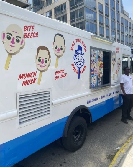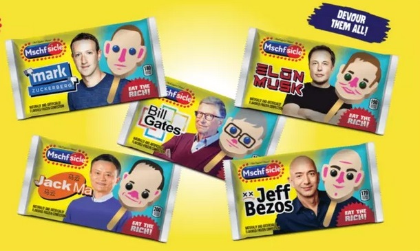 Художниците оферират да ядем богатите и тази акция продължава от 11 до 13 юли 2022 година Има пет усета, от които можете да избирате: Bite Bezos, (отхапи Безос), Munch Musk (подъвчи Мъск), Goble Gates (изяж Гейтс), Snack on Jack Джак (закуси с Джак), Suck Zuck (посмучи Зукърбърг). Сладоледът коства 10 $.
