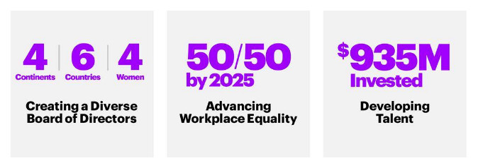 Подобряване на равнопоставеността на работното място. Accenture си е сложила за цел дамите да съставляват 50% от работната мощ на компанията в световен проект до 2025 година Днес дамите са 41% от всички чиновници на Accenture и 45% от новите чиновници.