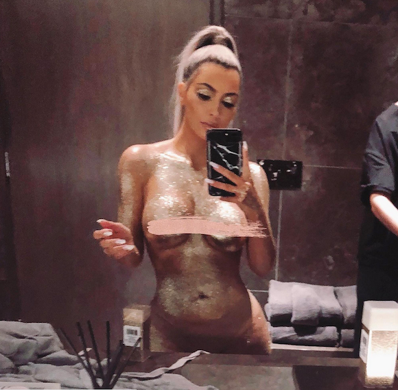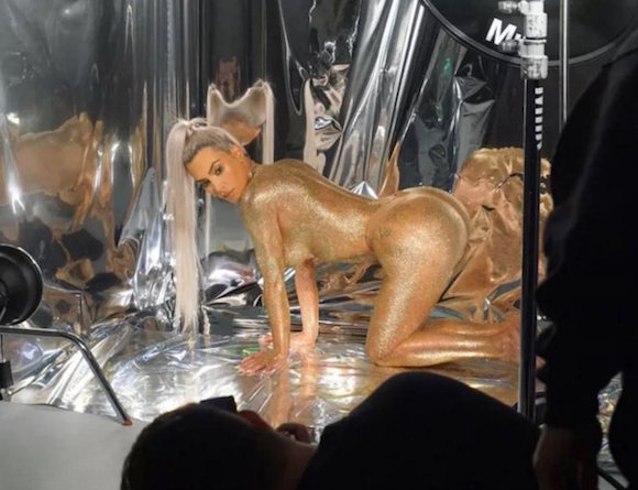 Тя в никакъв случай не се е срамувала да демонстрира обилната си фигура и този път не прави изключение. Ким Кардашян се снима чисто гола и покрита с бронзов брокат за рекламата на своята козметична марка “KKW Beauty”. 37-годишната някогашна брачна половинка на баскетболиста Крис Хъмфрис се прикрива само с ръцете си и оставя напълно малко на мъжкото въображение.