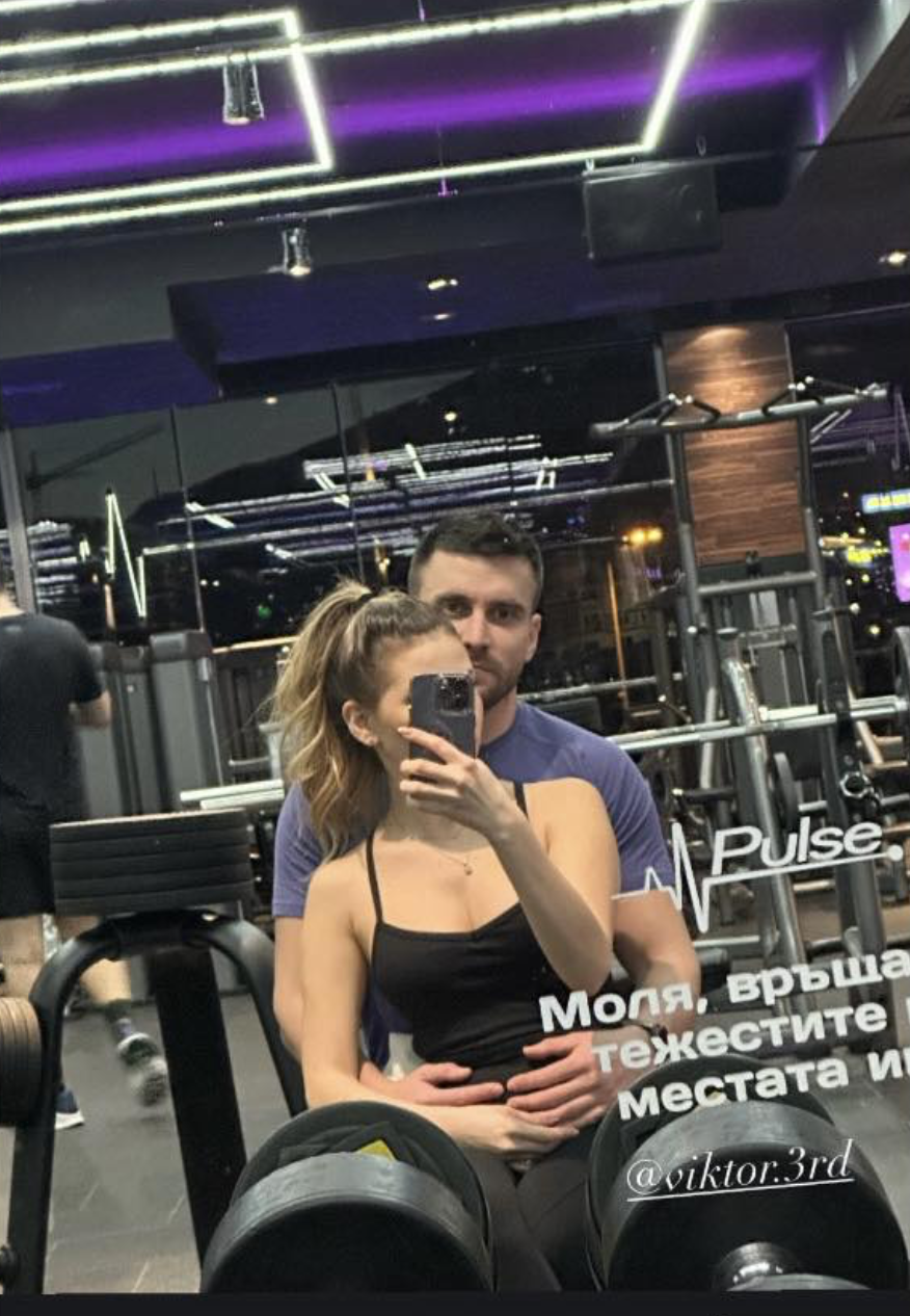 Тя разгласява фотоси в обществените мрежи - на първата се вижда голям букет с червени рози, а на втората - юристката и предприемачът спортуват дружно. Виктор е прегърнал нежно обичаната си, до момента в който тя им прави селфи в огледалото.