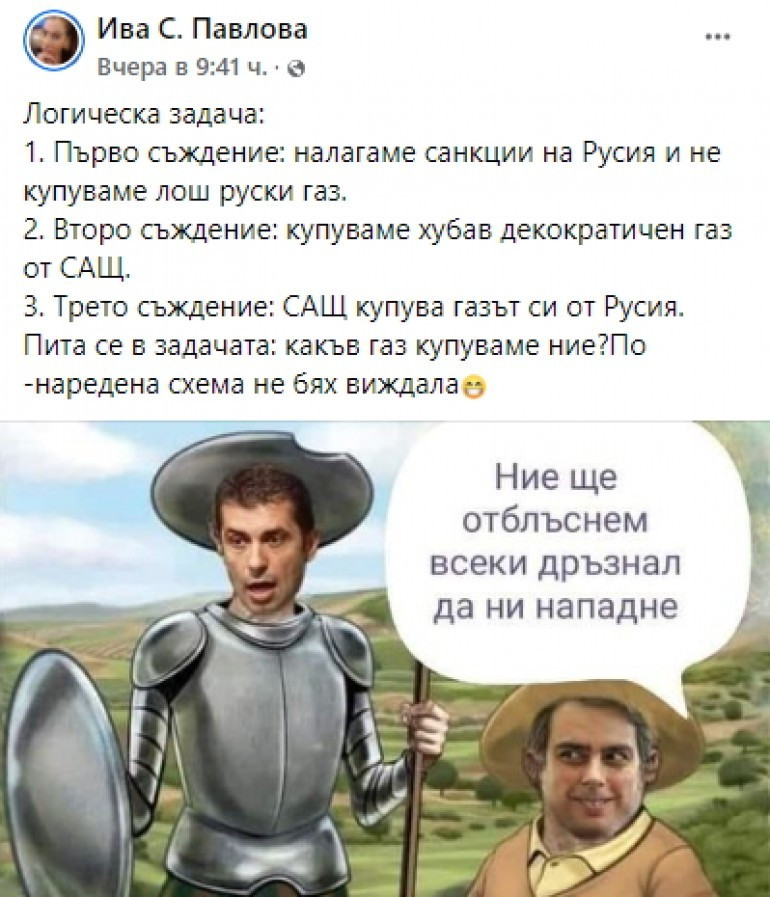 *** „ Мислех по празници да не пиша статуси,но олигофренията не се търпи!Уж ни била остаряла и за нищо не ставаща нашата оръженийна техника,ама аджеба тъкмо ние наложително би трябвало да си я дадем на Украйна,нещо не възприемам логиката?!Като толкоз желаете отивайте и се бийте за Украйна тия 10% гневни укрофили,а не да ни налагате да влизаме зорлем във война!Айде чемодан-вакзал -Украйна и се бийте огромните мъже,пък тук дамите ви да приберат по една -две украинки с децата им у вас и да си ги дондуркат и устоят с персонално ваши париP.S.Нас никой не ни е питал желаеме ли да сме в НАТО!! # дагодухатвсичкидебетапоземнитекълбета “
