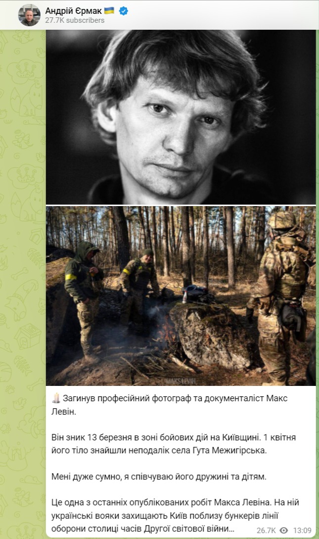 „ Той изчезна в конфликтен регион на 13 март в района на Киев. Тялото му бе намерено край село Гута Межигорская на 1 април “, уточни той в Телеграм.