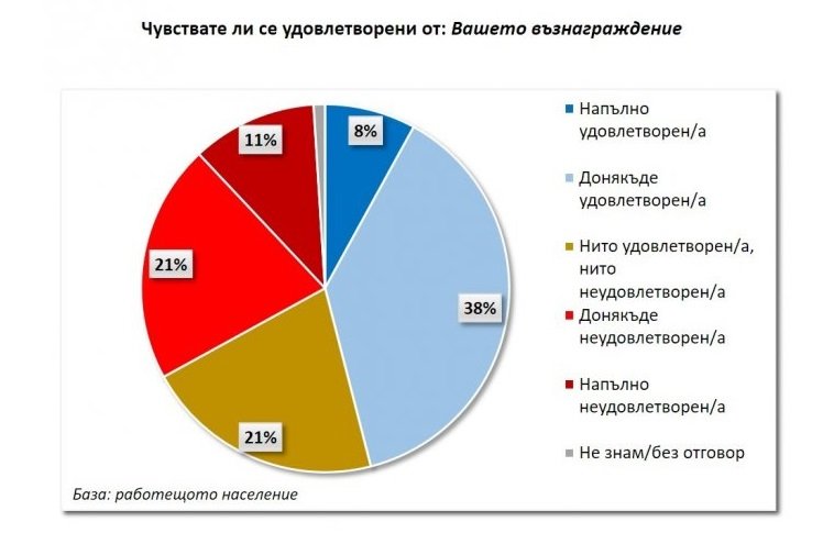 Що се отнася до заплащането, настоящата вълна на проучване демонстрира, че общо 46% от работещите у нас са удовлетворени от заплатата си, 32% обаче не са. Нито преобладаващо удовлетворени, нито преобладаващо недоволни са 21% от запитаните работещи у нас. Малцина са тези, които не могат да преценяват, демонстрират още данните от изследването.