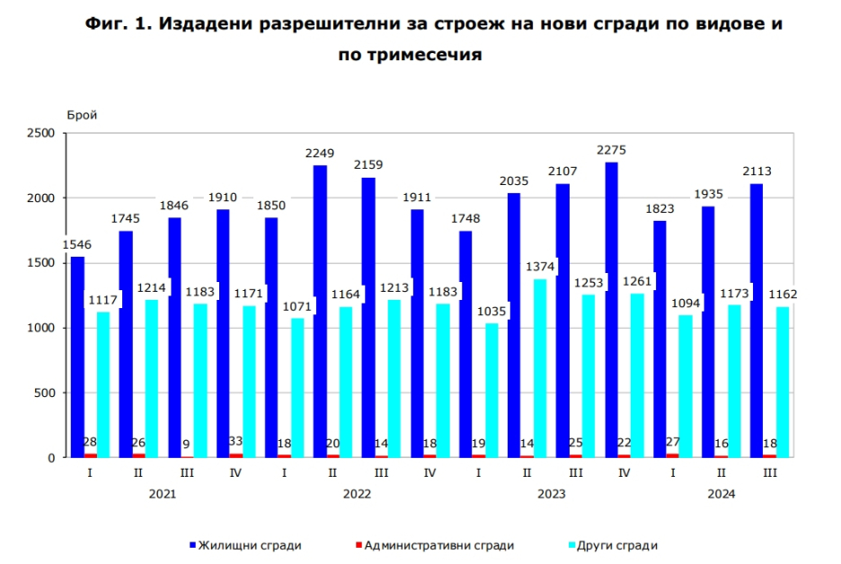 През третото тримесечие на 2024 година е почнал градежът на 1 553 жилищни здания с 6 707 жилища в тях и с 935 057 кв. м разгъната застроена повърхност, на 12 административни сгради/офиси с 22 028 кв. м РЗП и на 578 други здания с 438 921 кв. м РЗП.