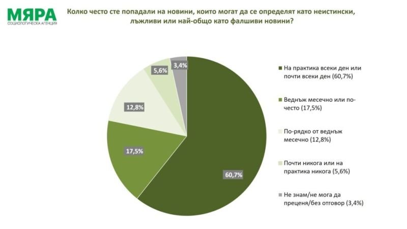 60,7% от българите настояват, че на процедура попадат всеки ден или съвсем всеки ден на вести, които могат да се дефинират като неистинен, лъжливи или най-общо като подправени.