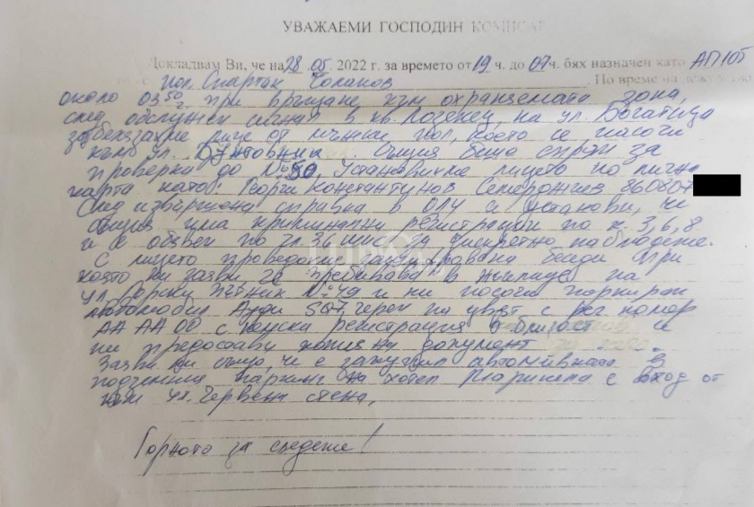 В отчета до своите шефове служителят на реда написа, че застъпил на промяна в 19 ч. на 28 май (четвъртък). Около 3,50 ч. на разсъмване в петък ченгетата стопират Георги Константинов Семерджиев на ул. „ Боготица “ в кв. „ Лозенец “.