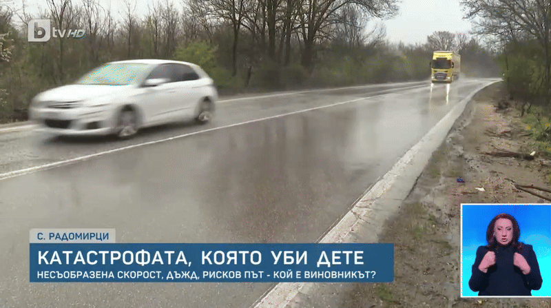 Опасността на пътя при дъждовно време пролича и в репортаж на bTV от мястото на тежката злополука.