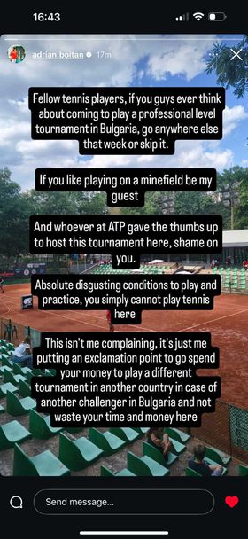 „ Колеги тенисисти, в случай че в миналото обмисляте да посетите шампионат на професионално равнище в България, отидете някъде другаде през тази седмица или го пропуснете. Ако обичате да играете на минно поле, заповядайте “ – написа Бойтан, представен от “Тенискафе ”.