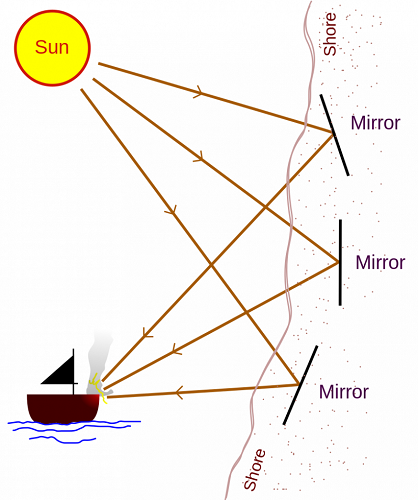 „ Вярвам, че с задоволително мощен източник на топлота и голям брой по-големи огледала, фокусирани под съвършен ъгъл, изгарянето може да е допустимо “, написа младият създател на проучването.Историческите описания на потреблението на „ лъча на гибелта “ на Архимед в антична Сиракуза са правдоподобни, само че не са открити археологически доказателства за съществуването му, също така, което е записано в книгите на античните философи.