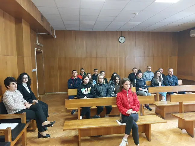 Учениците бяха приветствани с „ Добре пристигнали “ пред Съдебната палата от ръководителя на Окръжен съд – Кюстендил, арбитър Пенка Братанова, заместител – окръжния прокурор Марияна Сиракова и младши арбитър Мария Танева. Те бяха аудитория в правосъдна зала и следиха въззивни наказателни каузи, с предмет машинация и нанасяне на междинна телесна щета. Съдебният състав, който преглежда делата бе в състав: Съдия Пенка Братанова – ръководител и членове – арбитър Мирослав Начев / зам.- ръководител на съда / и арбитър Елисавета Деянчева. Прокурор Валери Пенков съставлява Окръжна прокуратура.
